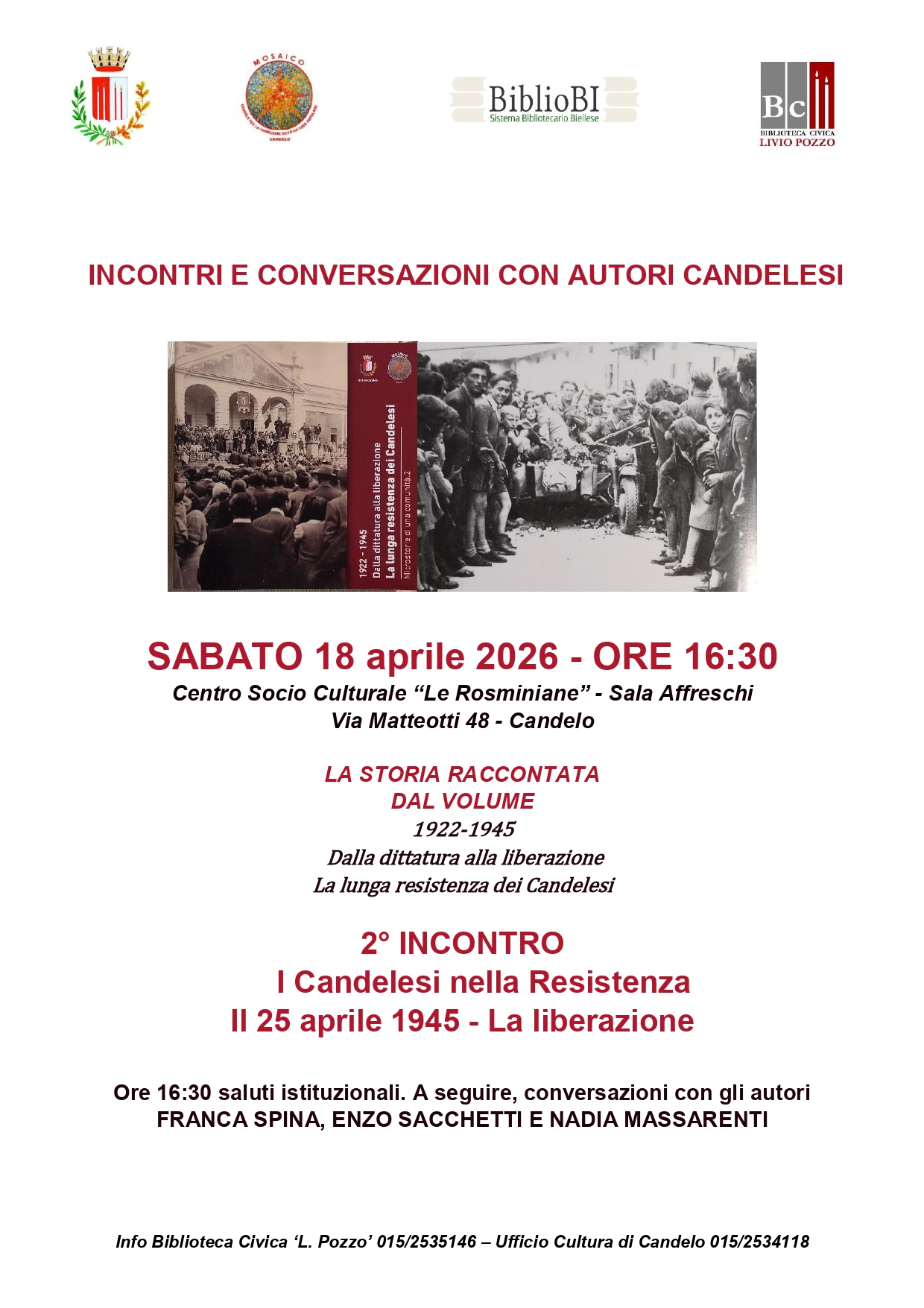 A guidare il pubblico in questo viaggio nella memoria saranno Franca Spina, Nadia Massarenti ed Enzo Sacchetti, autori del volume: “1922–1945: dalla dittatura alla Liberazione - La lunga Resistenza dei candelesi”.