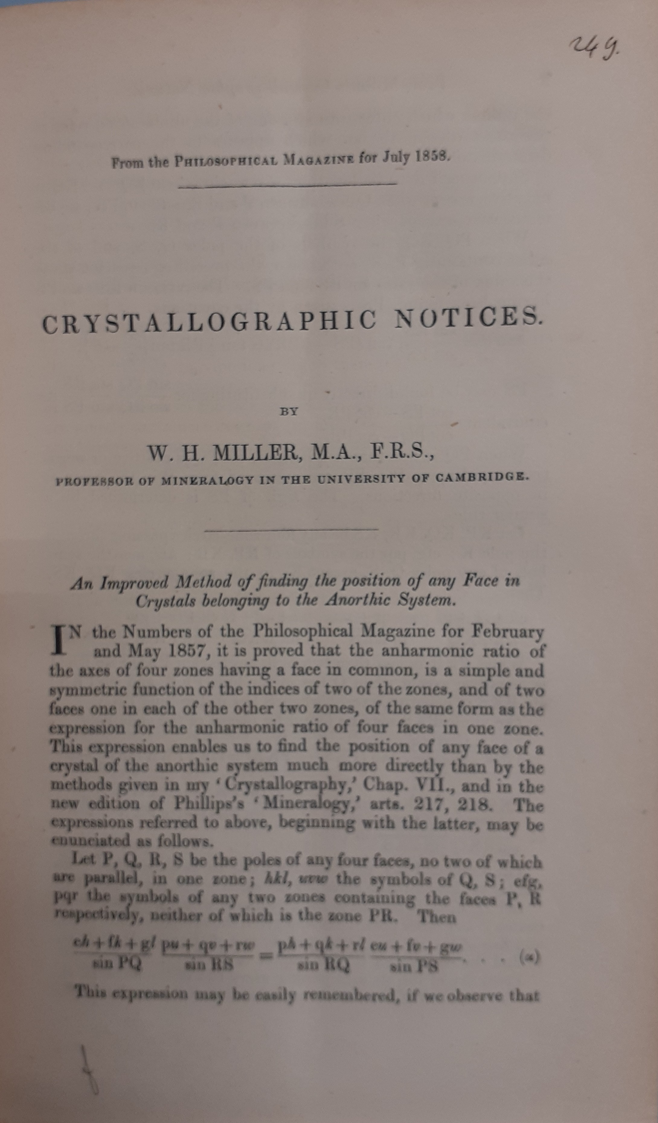 1 opuscolo in v. misc. - Legatura in mezza pelle e carta marmorizzata. - Sul dorso impressioni in oro e indicazione del possessore Quintino Sella. - Sul contropiatto ant. vecchie segnature. - Sulle carte di guardia ant. indici ms. dei volumi contenuti in misc.